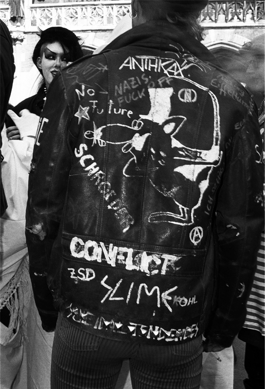 Widerstand kann sich also über Kleidung und Schmuck ausdrücken. Die als Ohrring umfunktionierte Kreditkarte versteht sich als Kapitalismuskritik. Jacken, häufig aus Leder und mit Nieten besetzt, werden zum Medium unterschiedlicher, auch politischer Botschaften – wie hier gegen Nazis und die Politik des damaligen Bundeskanzlers Helmut Kohl.
